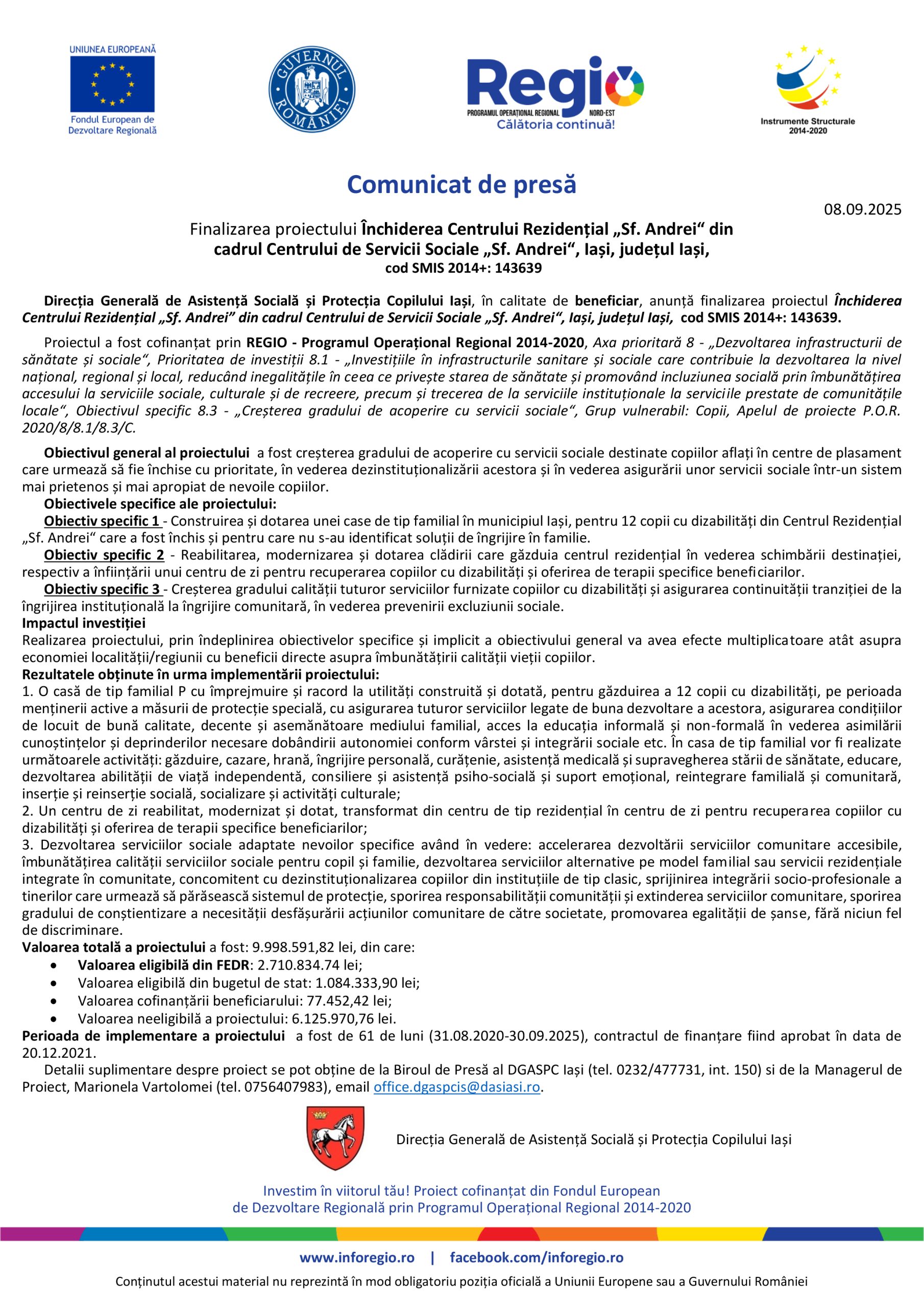 Închiderea Centrului rezidențial ”Sf. Andrei” din cadrul CSS ”Sf. Andrei”, Iași, jud.Iași, cod SMIS 2014+: 143639