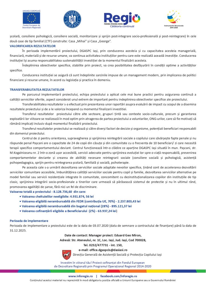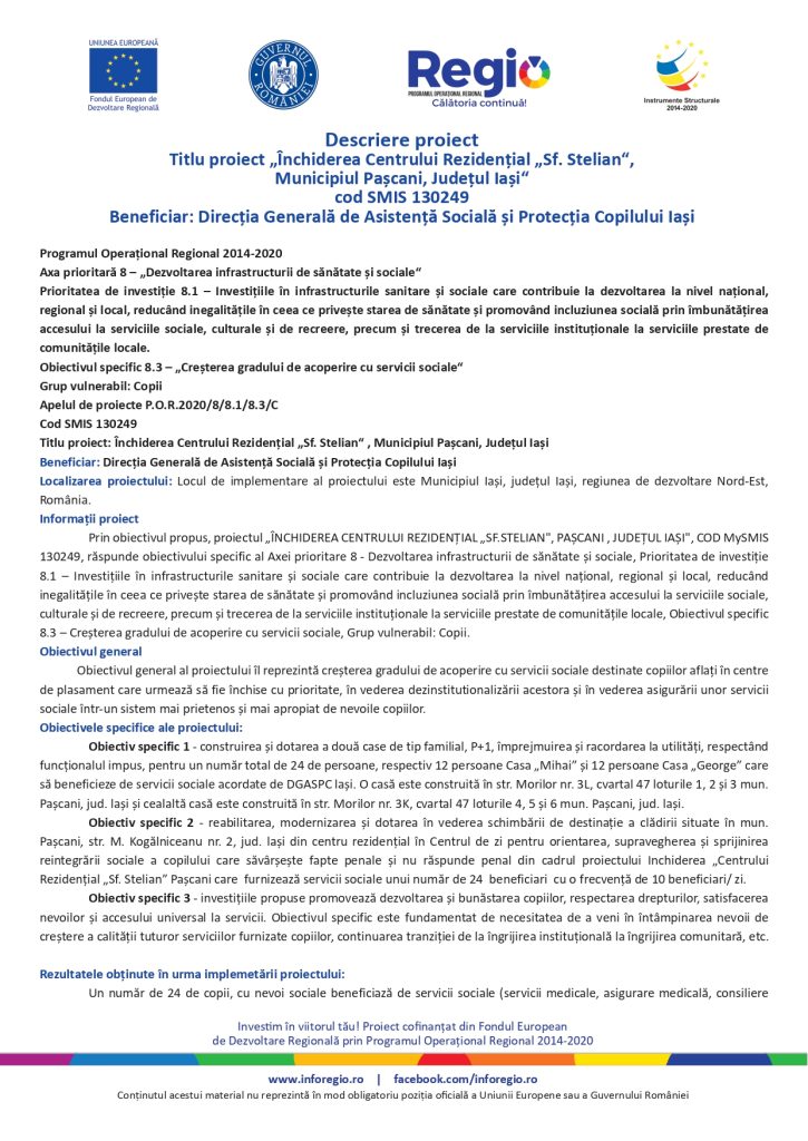 Proiect ”Închiderea Centrului Rezidențial ”Sf. Stelian”, mun.Pașcani, jud.Iași”, cod SMIS130249